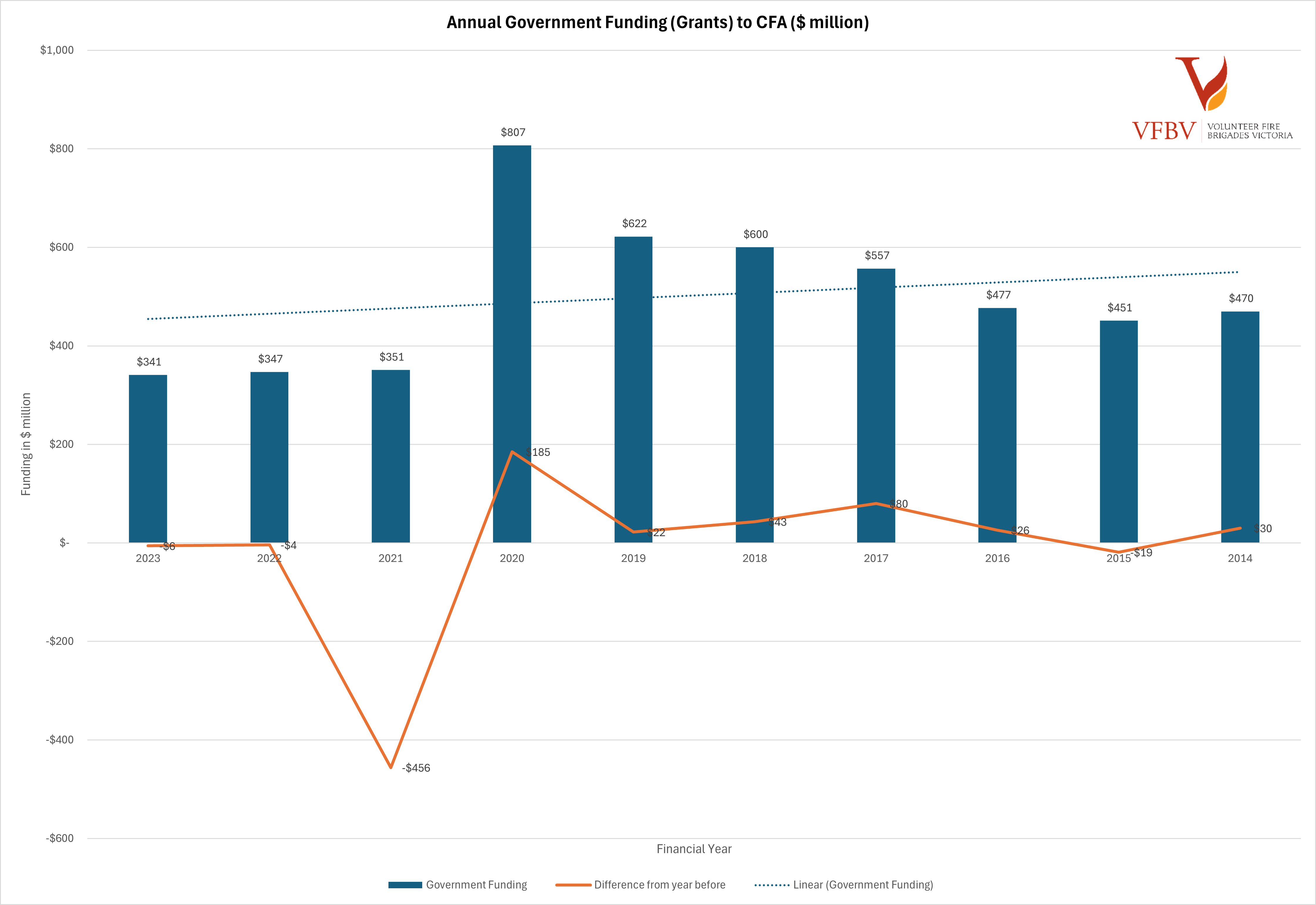 Put the last three years of fire service budgets side by side, and CFA’s annual grant from government has decreased every year for the last three years. Below you will find a chart we have compiled comparing the last ten years of government funding to CFA. (a larger version of the graph can be downloaded at the bottom of this page)