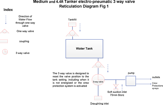 The 3 way valve requires to be energised to work in the draughting position. When not energised a spring mechanism in the 3 way valve always brings the valve back to the tank setting. This ensures if the tankers electrical system is disrupted during a burn over, the reserved tank water is available for protection of the crew in conjunction with the pump which will also remain functional unless switched off. This is a safety feature as any hose used for draughting during a burn over will not have protection afforded by the Crew Protection Sprays.