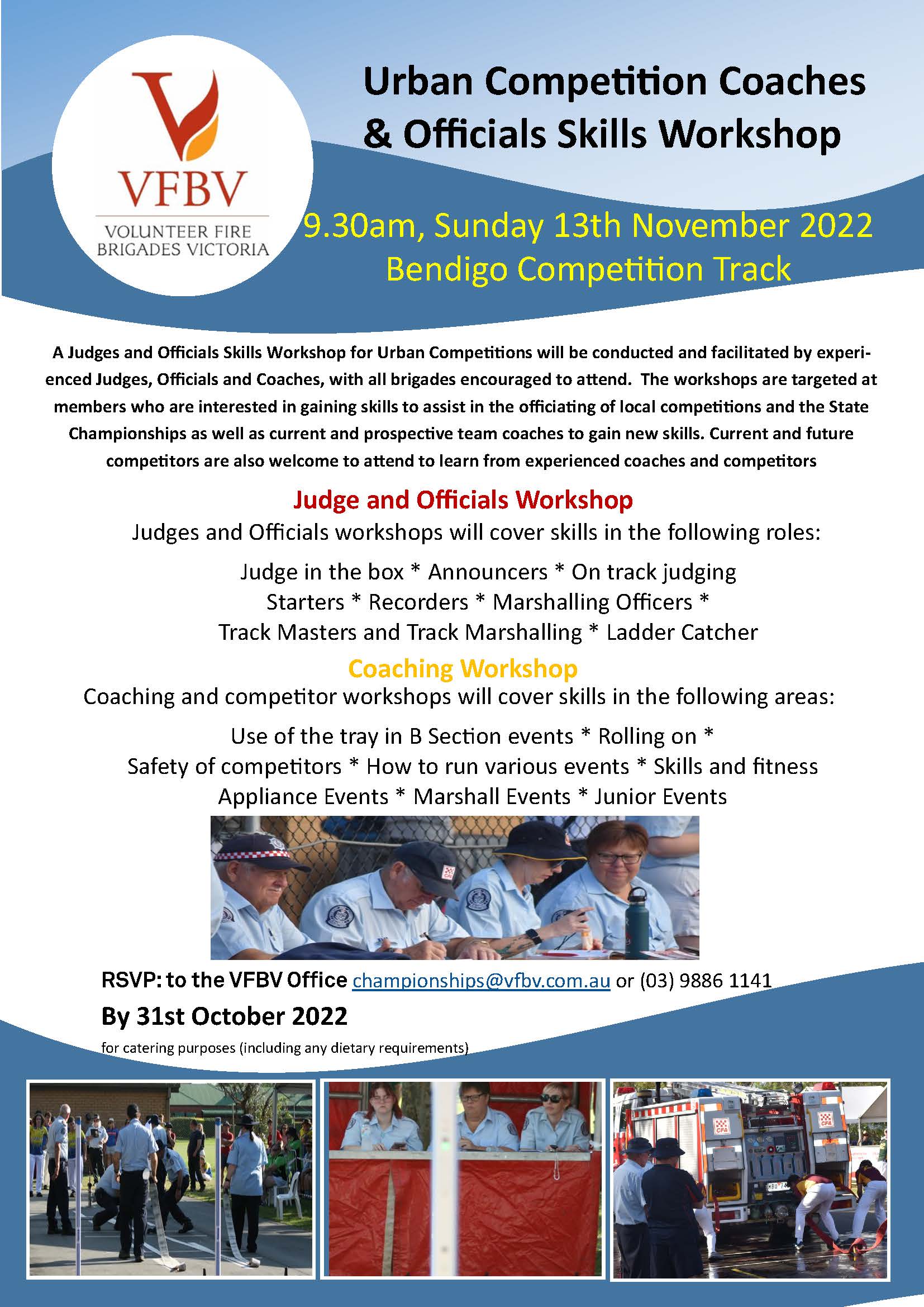 The Urban Competition and Rules Committee is holding a Coaches and Officials  Skills workshop on 13 November 2022 at the Bendigo Competition Track beginning at 9:30am.