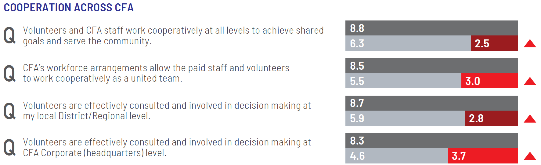 This positive result also likely reflects the positive reaction volunteers have had on CFA’s acknowledgment to VFBV feedback on the unachievable requirements originally proposed in draft doctrine that was released last year in relation to driver training and the finance policies – both of which were significantly improved after CFA’s consideration of the feedback received during consultation.