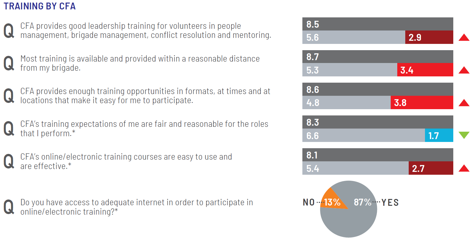 On a somewhat positive note, one of the few improvements in volunteer satisfaction was on the question “CFA’s training expectations of me are fair and reasonable for the roles that I perform” which recorded a satisfaction score of 1.7 which was a significant improvement on the 2.0 dissatisfaction it scored the year before. This provides confirmation that volunteers are not just being negative and demonstrates that they want to undertake the training and feel it is reasonable – they simply cannot access it where and where they need it.