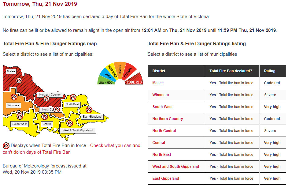 You can access current and updated CFA Total Fire Ban advice and ratings here: https://www.cfa.vic.gov.au/warnings-restrictions/total-fire-bans-and-ratings