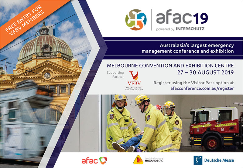 VFBV will be on stand #595 and members are welcome to drop by and have a chat. We will have laptops on hand so volunteers can complete this year’s VFBV Welfare & Efficiency Survey while they are there. Our colleagues from our National Body will also be present, with the Council of Australian Volunteer Fire Associations (CAVFA) on stand #597 who we’ll also be helping out during the week.