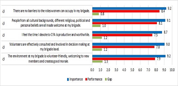 - Volunteer members of Integrated brigades had the biggest gap between expectations and performance when comparing their results with members of other brigade types. The only exception was for volunteer members of Urban brigades who indicated lower levels of satisfaction in relation to the location of, accessibility to and lack of opportunity for training