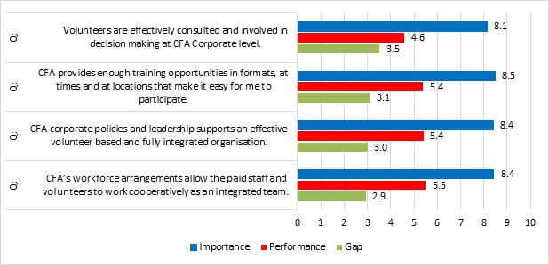 - A comparison between volunteers with different lengths of service history shows that the longer a volunteer remains with CFA, the bigger the gap between expectation and performance widens. Satisfaction continues to show improvement generally after 16 years of service