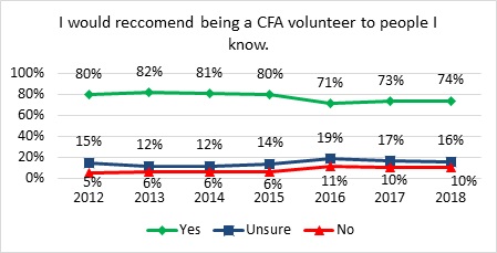 - Ratings for both intention to continue volunteering and recommending CFA to others has increased when compared with 2016 results