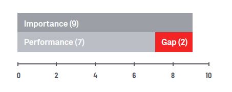 The relative measure of how closely performance meets the expectation of Importance, is referred to as the Gap. The illustration below, demonstrates the calculation of the Gap derived for each statement, which is then averaged to provide the Gap for each theme.